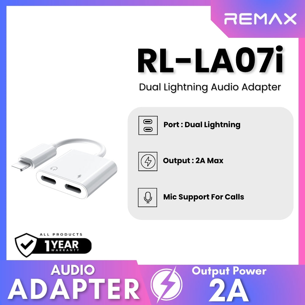 REMAX - RL-LA07i Concise Series Dual Lightning Audio Adapter Description Material: ABS+TPE Output current:5V-2A MAX Length: 60mm...