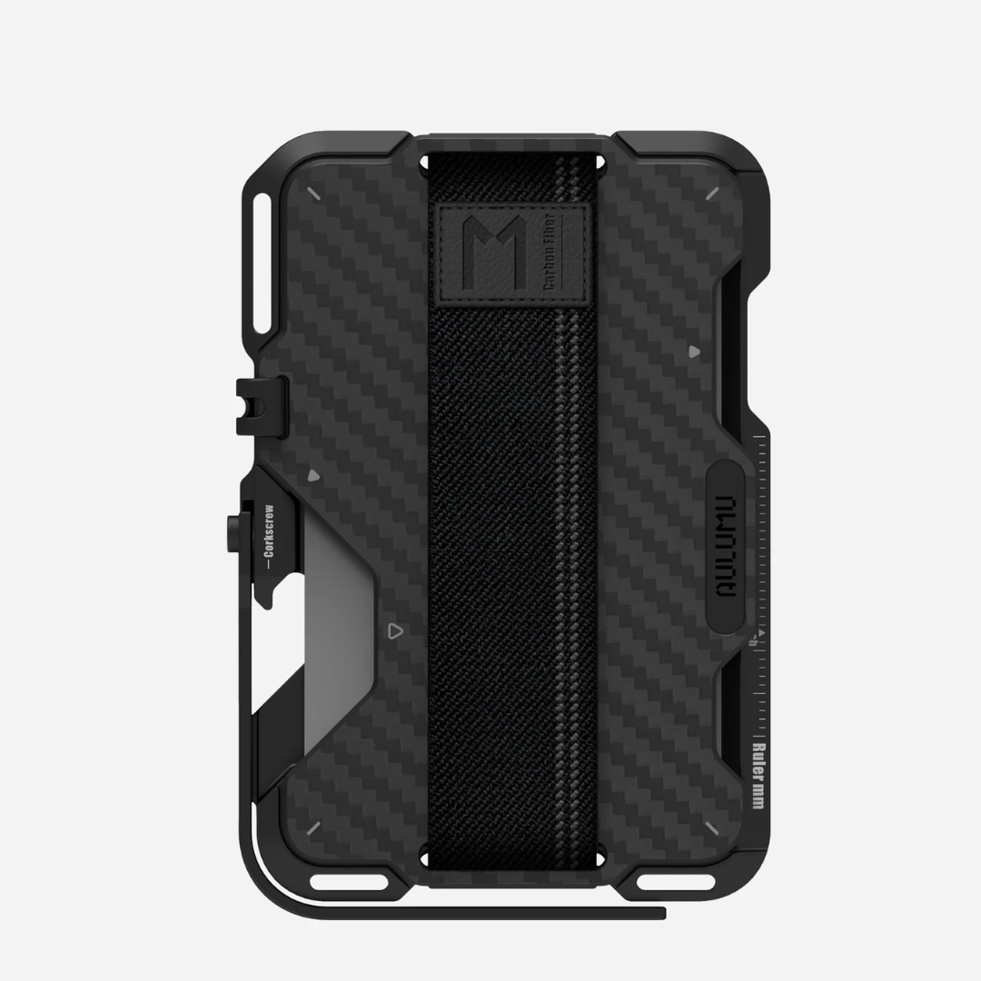 he G03 MagSafe Metal Wallet with carbon fiber cover is a premium EDC accessory designed for those who prioritize lightweight durability, style and function. It has tools easily accessible, a phone kickstand, a bottle opener, and a mini ruler. Constructed from aluminum alloy, this wallet is exceptionally resilient to daily wear and tear. The genuine leather cover not only adds a sleek and futuristic aesthetic but also enhances the overall structural integrity.