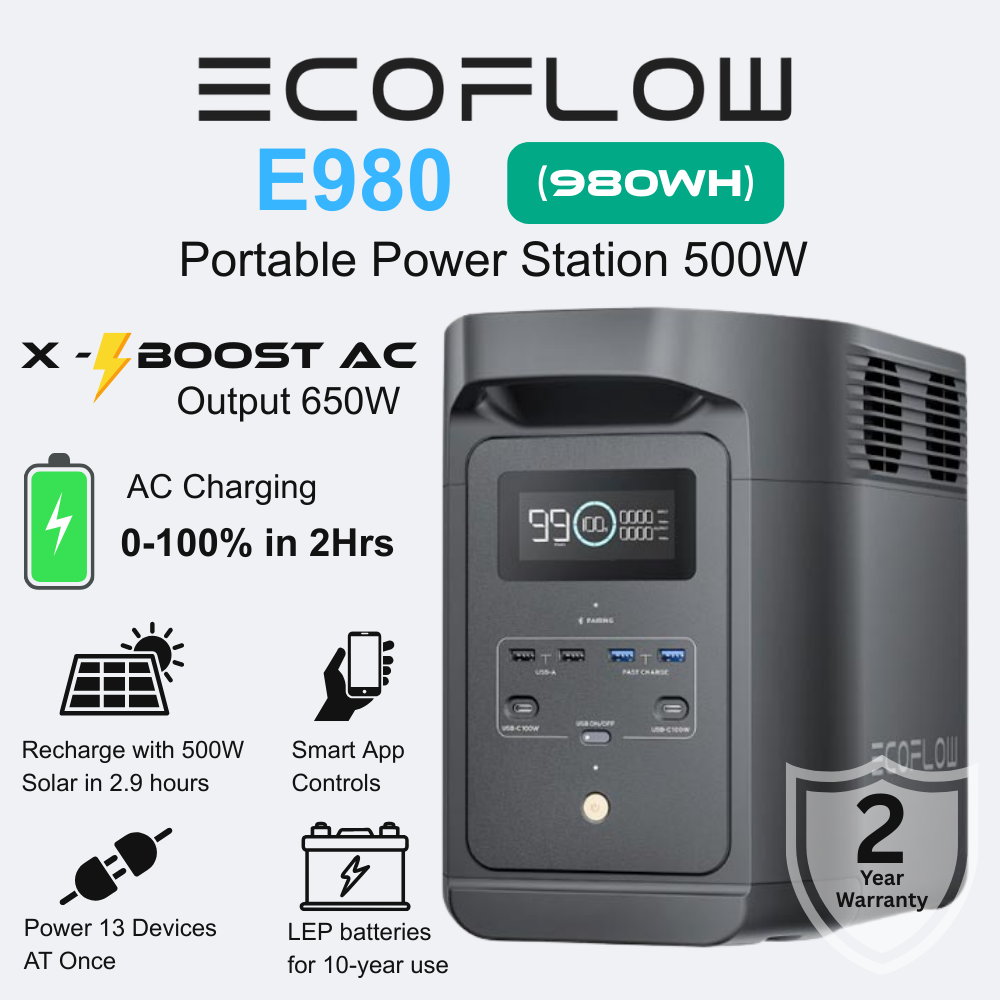 Adapt to any environment with four convenient charging options—AC, car, solar, and USB-C hence ensuring you stay connected wherever you are. Manage settings effortlessly through smart app control and an intuitive LCD screen, which provides real-time performance updates at a glance. With a FREE GIFT included, the EcoFlow E980 transforms your power management into a seamless, versatile experience designed to keep you ahead.