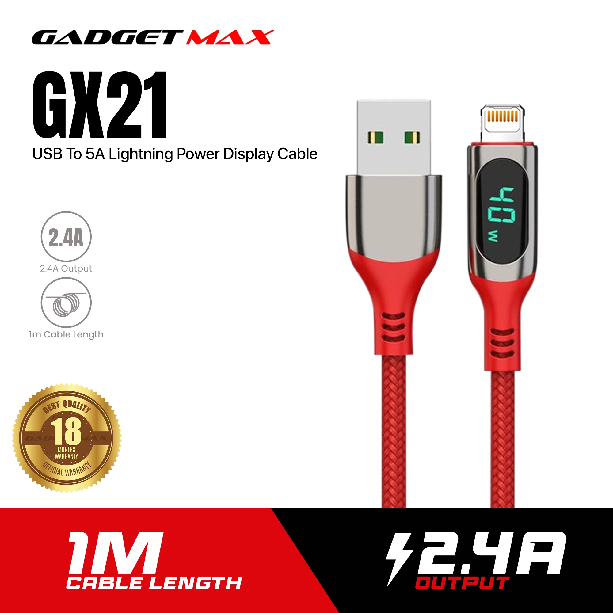 GADGET MAX GX21 USB TO LIGHTNING POWER DISPLAY CABLE (1M)(2.4A) - BLACK