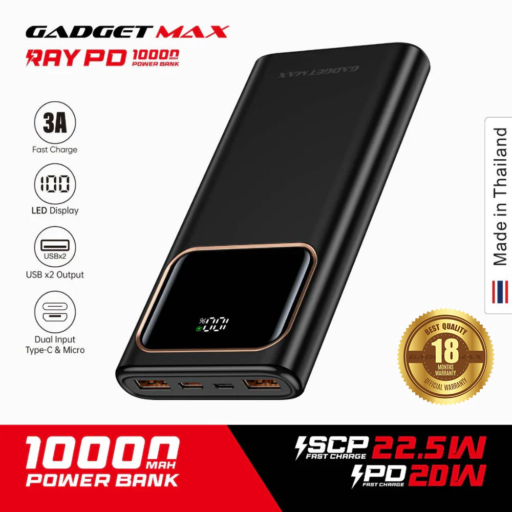 GADGET MAX RAY PD Series 10000mAh PD+QC Fast Charging Power Bank(PD 20W+QC 22.5W) Description Made In Thailand...