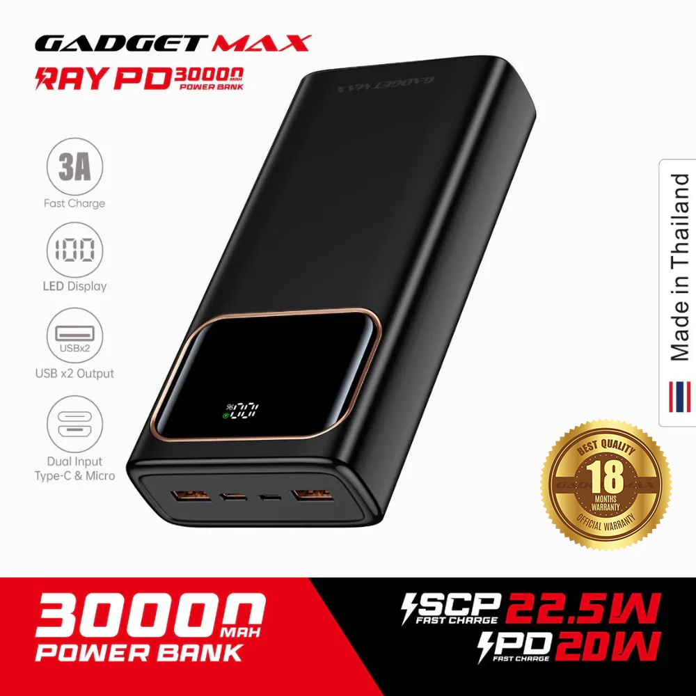 GADGET MAX RAY PD Series 30000mAh PD+QC Fast Charging Power Bank(PD 20W+QC 22.5W) Description Made In Thailand...