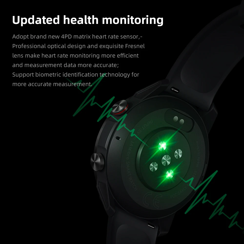 Comprehensive Health Monitoring: 24/7 updated **4PD heart rate**, **SpO2**, **sleep**, **stress tracking**, and **breathing training**.