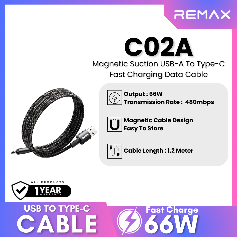 REMAX - C02A Magnetic Suction USB To Type-C Fast Charging Data Cable (66W) - Black