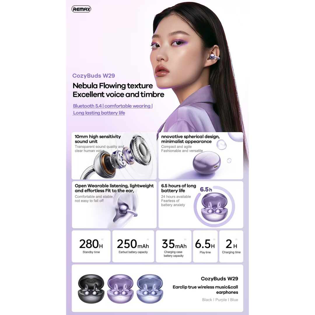 REMAX - Cozybuds W29 Clip-On Bluetooth Wireless Earbuds Description Innovative spherical design, minimalist appearance, small and flexible,...