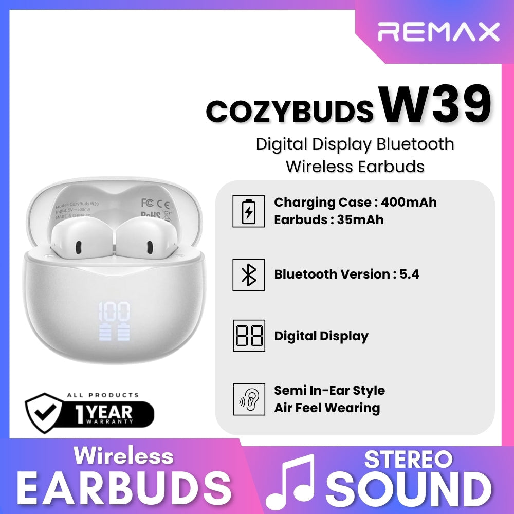 REMAX - CozyBuds W39 V5.4 Digital Display Bluetooth Wireless Earbuds Description Semi in-ear style, air feel wearing,...