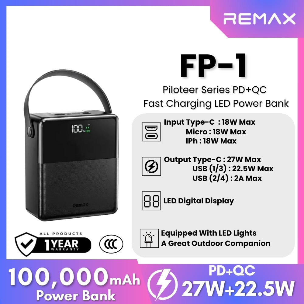 REMAX - FP-1 Piloteer Series 100000mAh PD+QC Fast Charging LED Power Bank ( PD 27W + QC 22.5W )