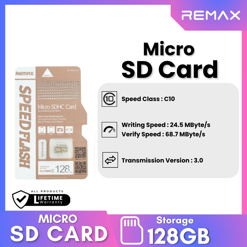 REMAX - Micro SD Card (128GB) Description Manufactured: Taiwan. Speed Class: C10 Transmission version: 3.0 Writing Speed(around):...