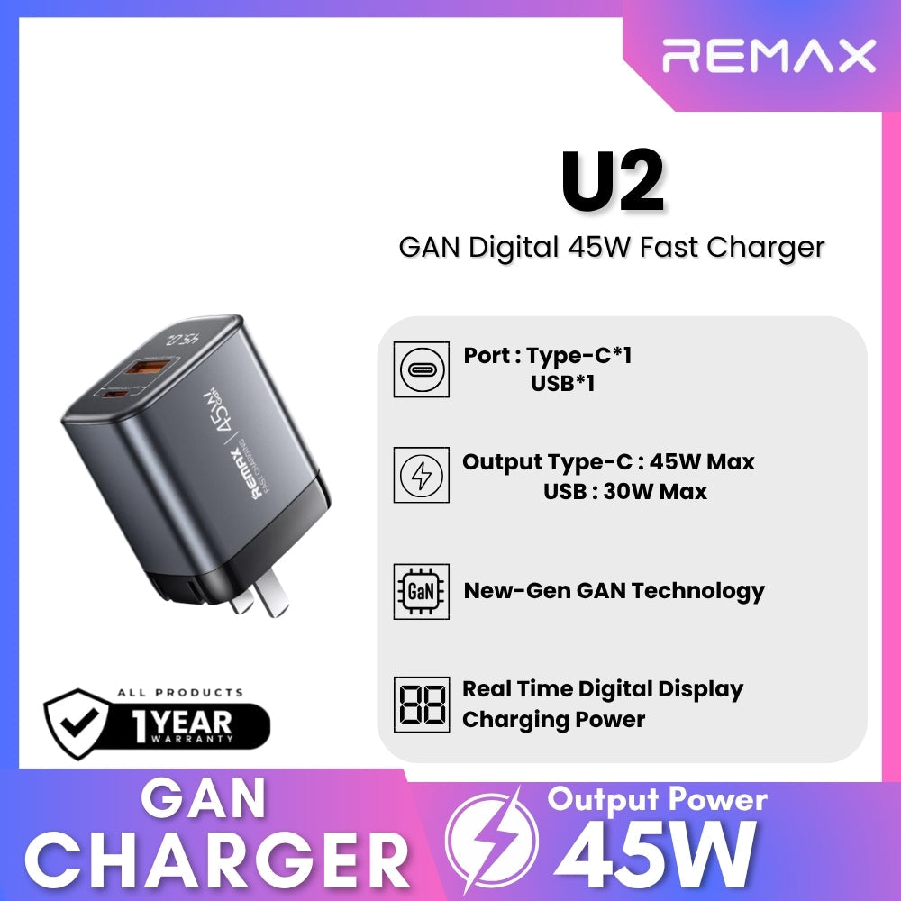 REMAX - U2 45W GAN Digital Fast Charger ( PD+QC )