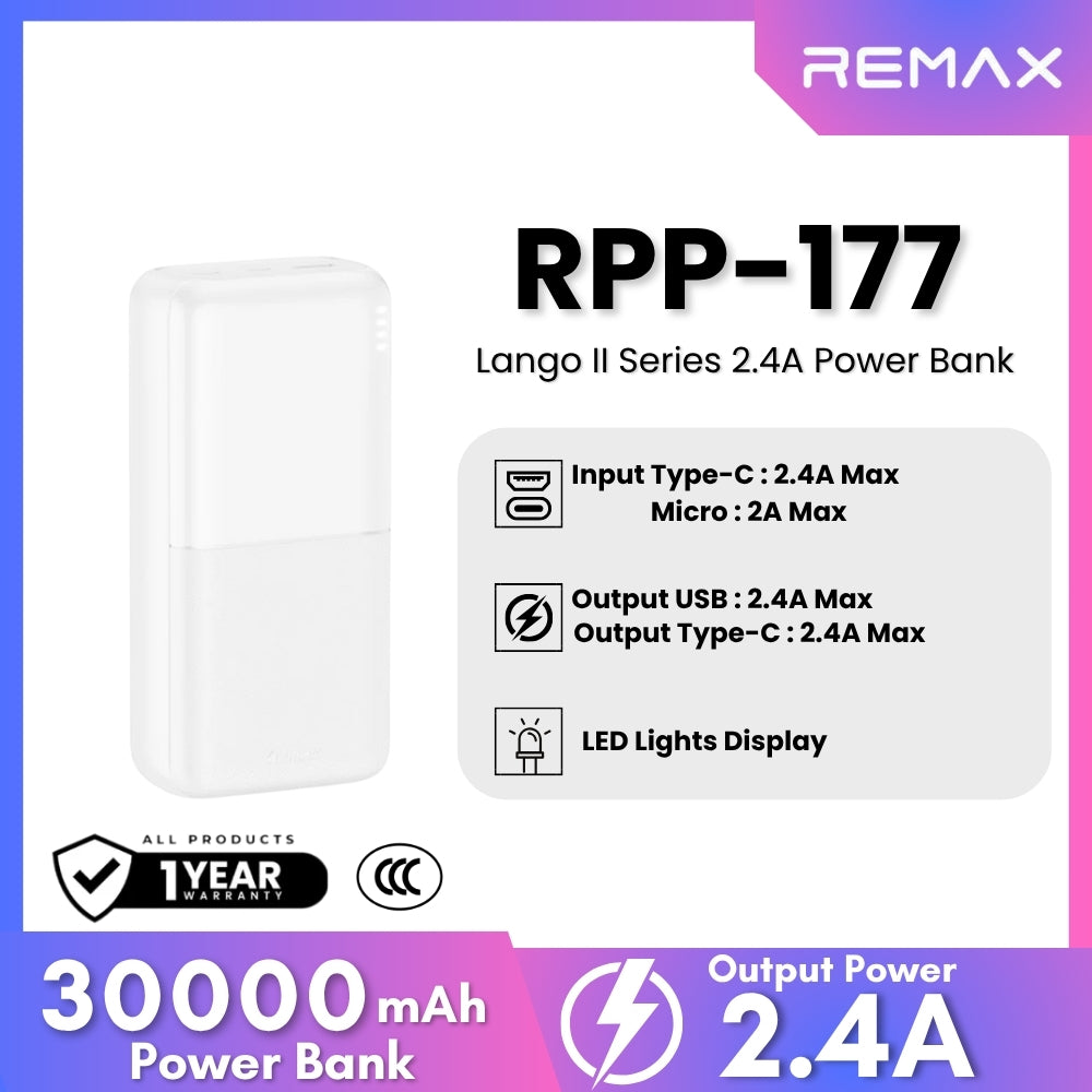 REMAX - RPP-177 Lango II Series 30000mah 2.4A Power Bank Description Battery Capacity: 30000mAh Real Capacity: 30000mAh...