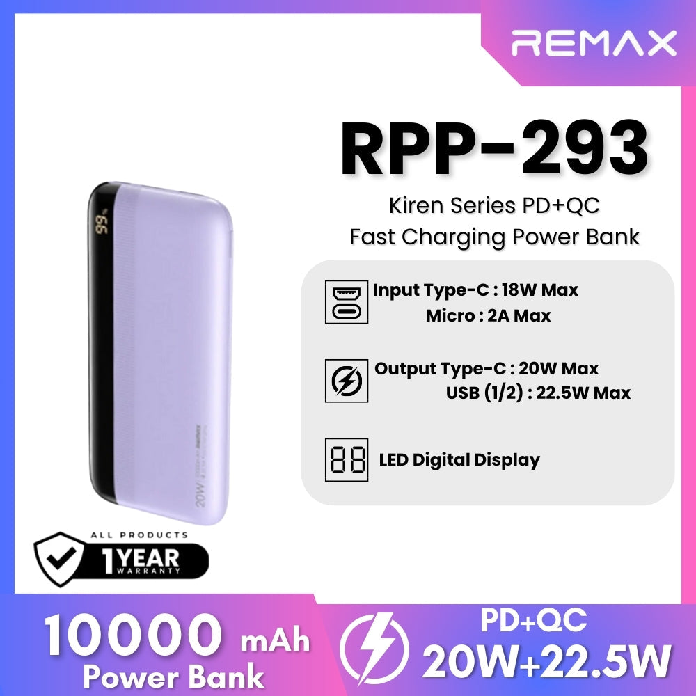 REMAX RPP-293 Kiren Series 10000mAh PD+QC Fast Charging Power Bank(PD 20W+QC 22.5W)