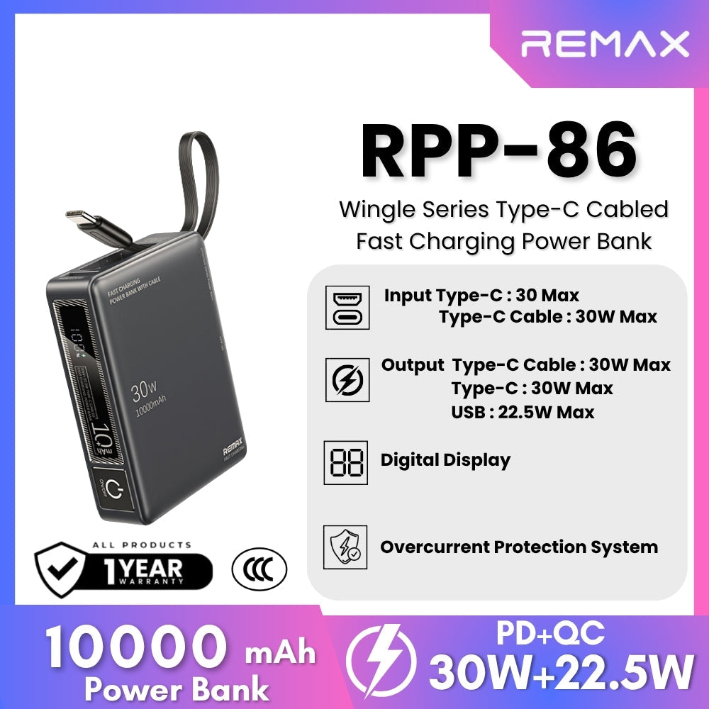 REMAX - RPP-86 10000mAh Wingle Series Type-C Cabled Fast Charging Power Bank (PD30W+QC22.5W) Description Fast charging capability...