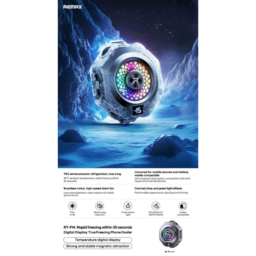 REMAX - RT-F14 Digital True Icing Cell Phone Cooler Description Product Color: Gun Black Product Material: ABS-Aluminum-Ceramic...