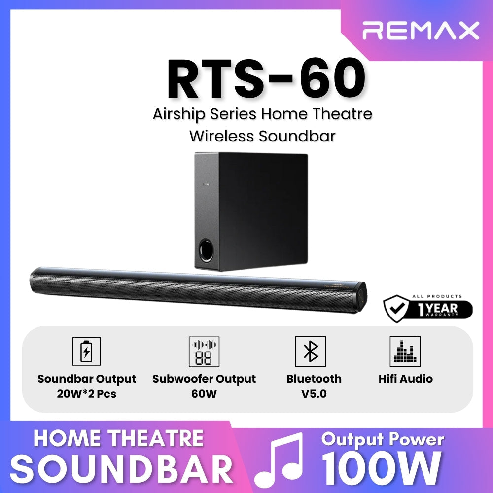 Remax - RTS-60 Air Ship Series Home Theatre Wireless Soundbar Speaker Description Material: ABS+PVC Bluetooth Version/chipset: AB5309/5.0...