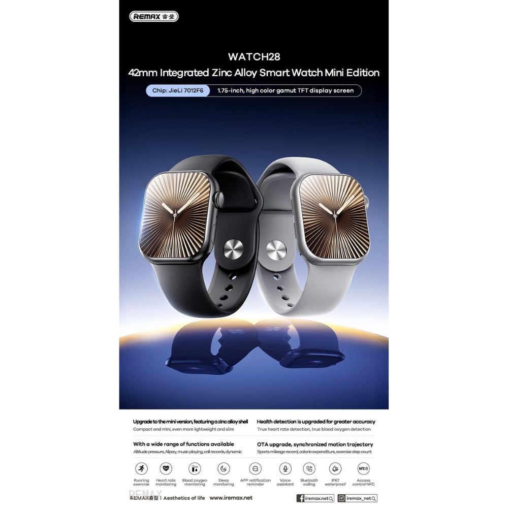 REMAX - Watch 28 Intergrated Smart Watch Description Product Color: Glossy Black, Frosted Silver Product Material: Zinc...