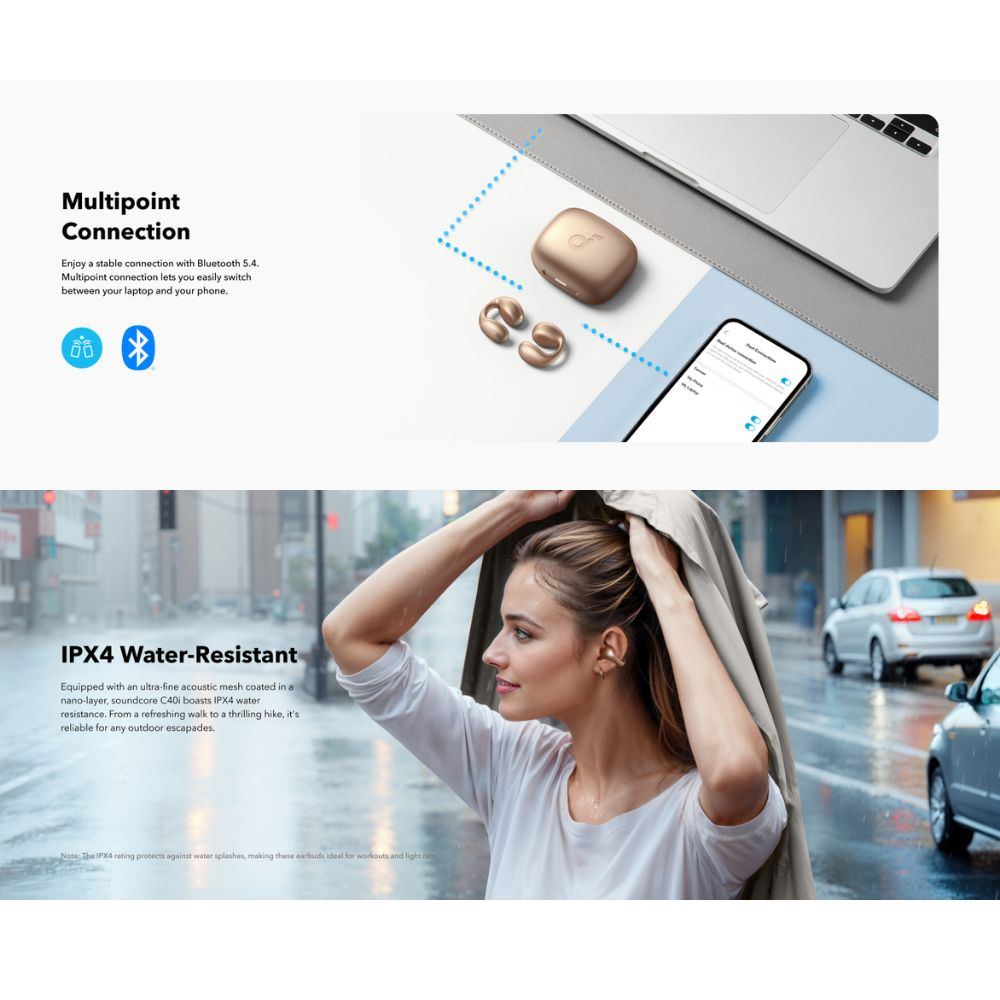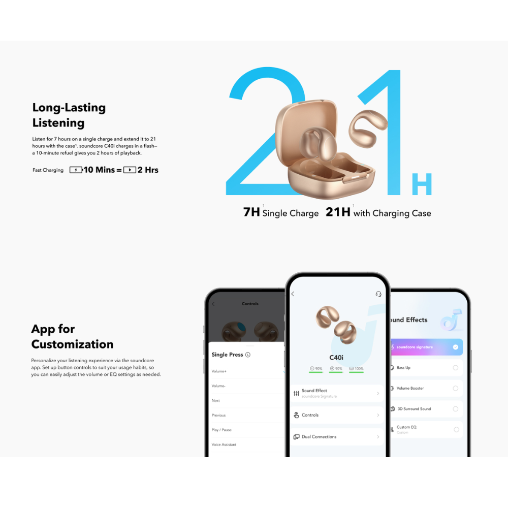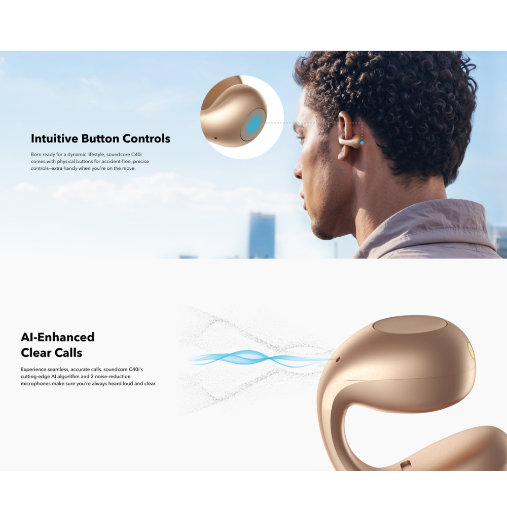 Intuitive Button Controls: Born ready for your active lifestyle, soundcore C40i open-ear earbuds comes equipped with physical buttons for precise, accident-free control—extra handy for on-the-go use.