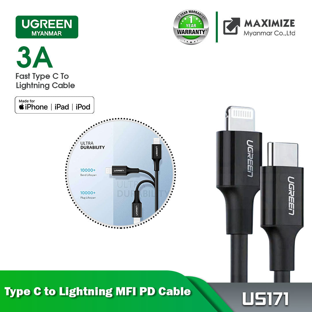 UGREEN ---USB-C TO LIGHTING CABLE M/M NICKEL PLATING ABS SHELL 1M PD 36 W, Type C To IPhone , USB C To IPhone , Type C To Lightning, USB C To Lightning, IPhone 12 Cable, Cable For IPhone 12. Tested 5v/ 2.1A Charging Cable.